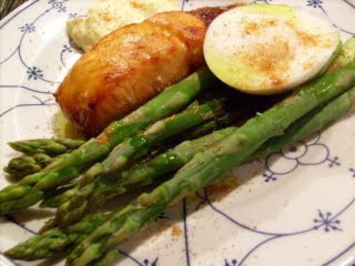 - Auch ein Stück gegrillter Lachs und Hollandaise Löffel Glas, natürlich, gute Maille Frankreich - Leckereien.