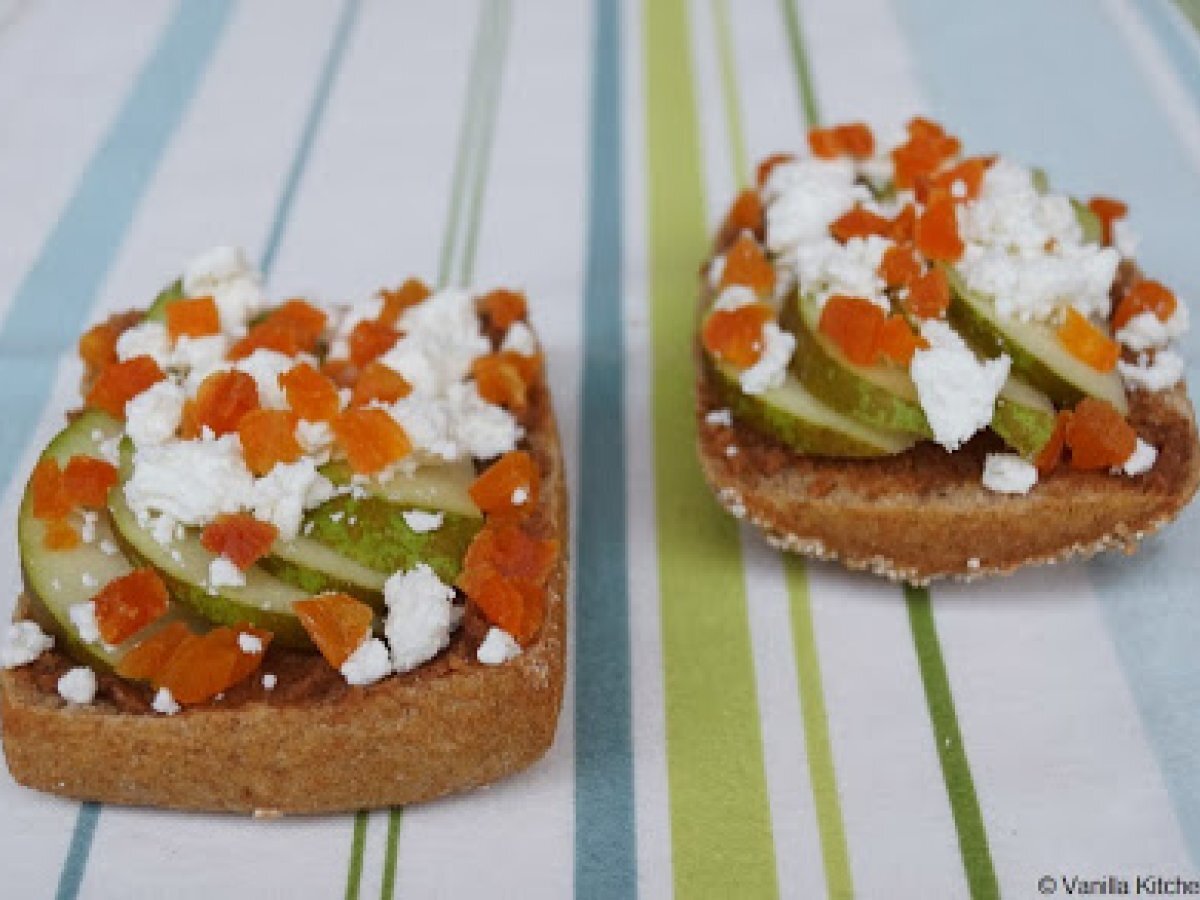 - Waschen Sie die Birne in Viertel geschnitten und der Länge nach in dünne Streifen schneiden und dann beweisen, das Brot mit ihm. DieAprikosen in kleine Stücke schneiden, zerbröckeln Ziegenkäse und verteilt am Ende der beiden oberen.