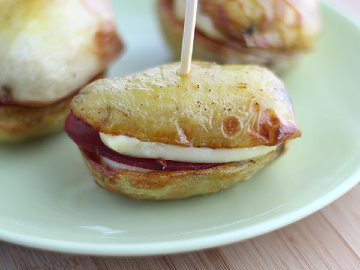 Aus dem Ofen nehmen und eine halbe Scheibe Rohschinken auf die Hälfte der Kartoffeln legen. Eine Hälfte der Kartoffel darauf legen und mit einem Spieß oder Bindfaden die Kartoffel festhalten.