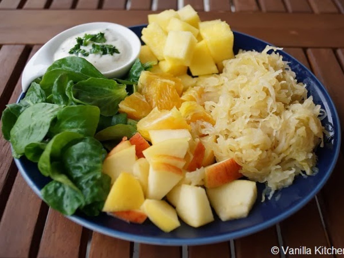 - Den Salat entstielen, waschen, trocknen. Den Apfel waschen und in kleine Stücke schneiden, die Orange und Ananas ebenso. Alle Zutaten auf einem Teller anrichten.
