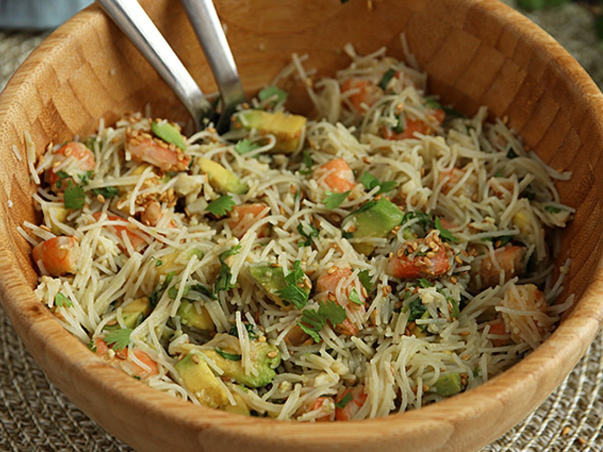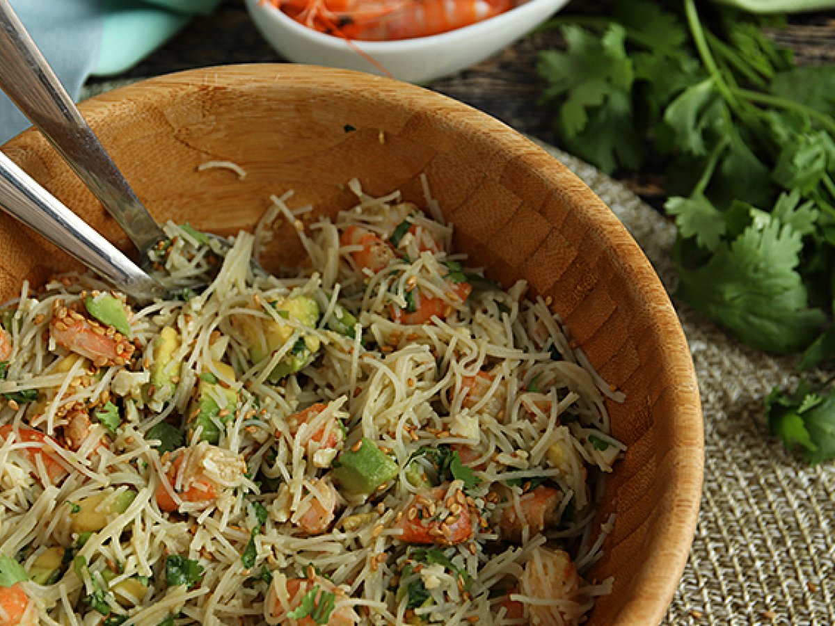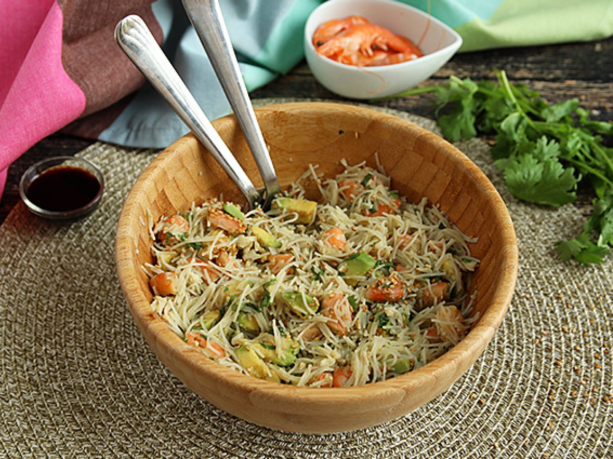 Salat aus fadennudeln, garnelen, avocado, ei und koriander