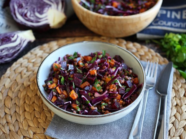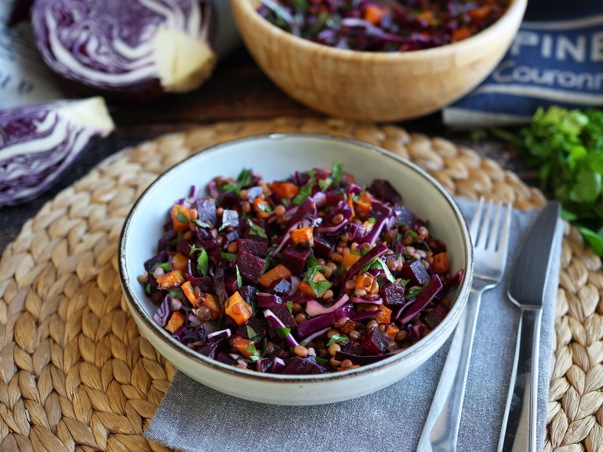 Wir bei Petitchef lieben Salate so sehr, dass es für uns im Herbst/Winter nicht in Frage kommt, darauf zu verzichten. Tauschen Sie also Ihr rohes Gemüse gegen Saisongemüse aus, indem Sie Rotkohl, Rüben und Butternusskürbis mit Linsen und Petersilie kombinieren. Ein einfach zuzubereitendes, schnelles und vegetarisches Rezept. Was Sie gesund essen sollten, während Sie pflanzliches Eiweiß und Ballaststoffe ;-) auffüllen