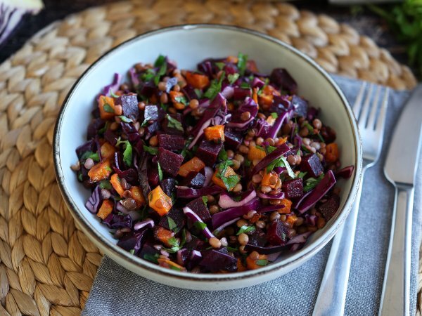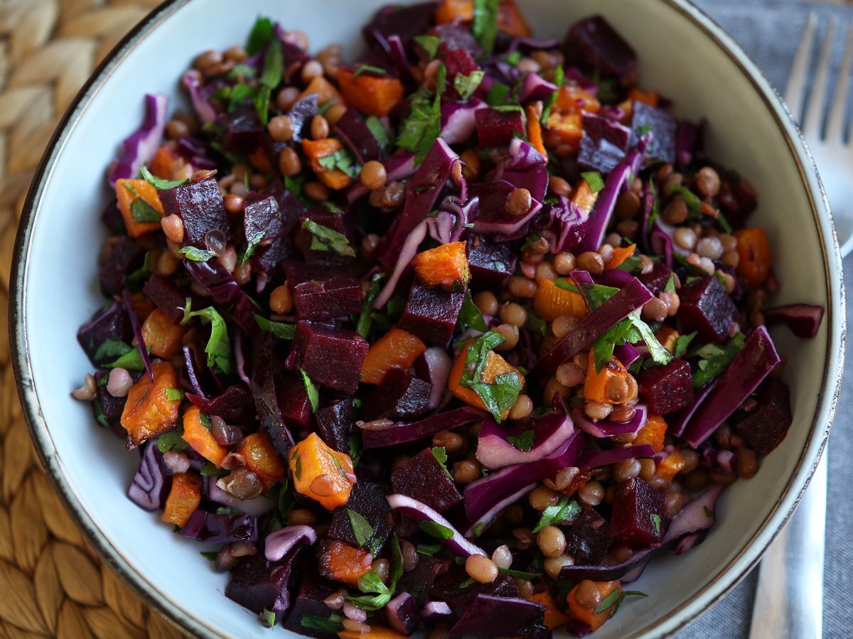 Salat aus linsen, butternut, rotkohl, rote bete und petersilie (perfekt für herbst/winter)