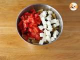 Den Feta und die in Stücke geschnittenen Tomaten sowie die Oliven hinzufügen.