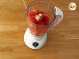 Geben Sie die geschälten und in Stücke geschnittenen frischen Tomaten und die Knoblauchzehe in einen Mixer. Pürieren Sie das Ganze. Wenn keine Stücke mehr übrig sind, fügen Sie das Salz hinzu und mixen Sie erneut.