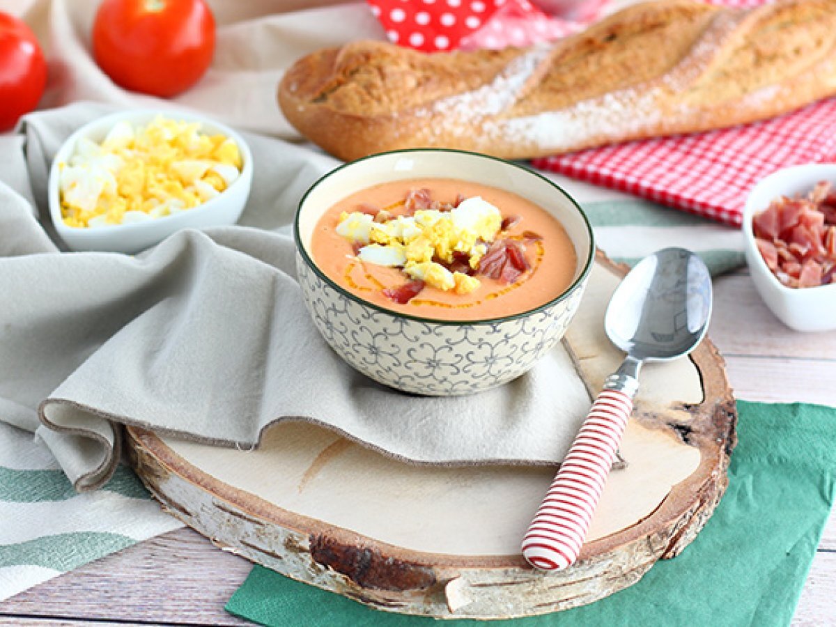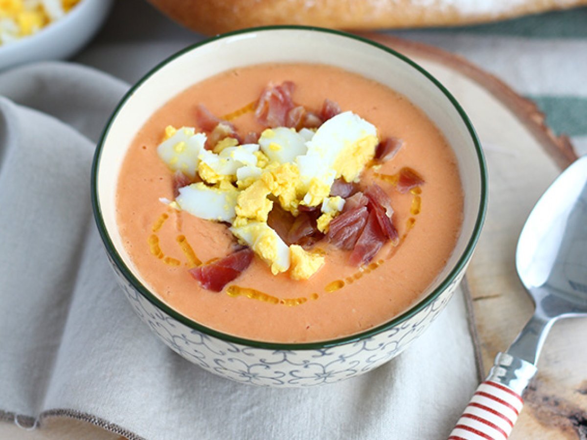 Mögen Sie spanische Gazpacho? Dann werden Sie Salmorejo lieben! Diese kalte, dickflüssige und schaumige Tomatensuppe kommt direkt aus Córdoba (Südspanien) und wird Ihre Geschmacksknospen beim Aperitif oder bei der Vorspeise zum Kribbeln bringen. Ein extra einfaches Rezept, das nicht gekocht werden muss und für das Sie nur sehr wenige Zutaten benötigen. Traditionell wird sie mit Schinken und Eiern auf der Oberseite serviert, aber Sie können sie nach Belieben mit Ihren Lieblingsspeisen zubereiten :-)