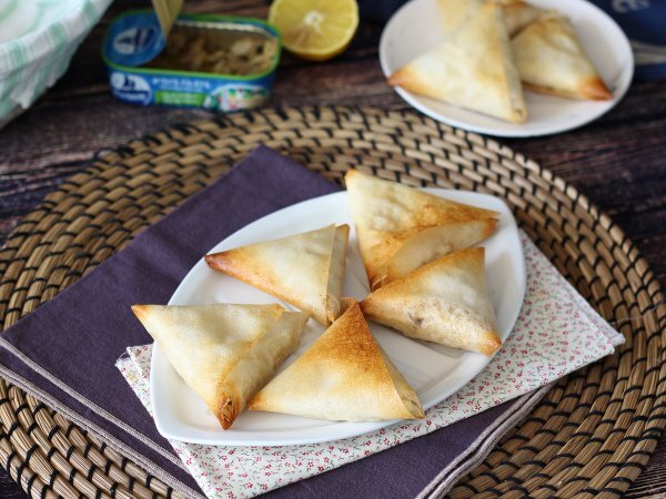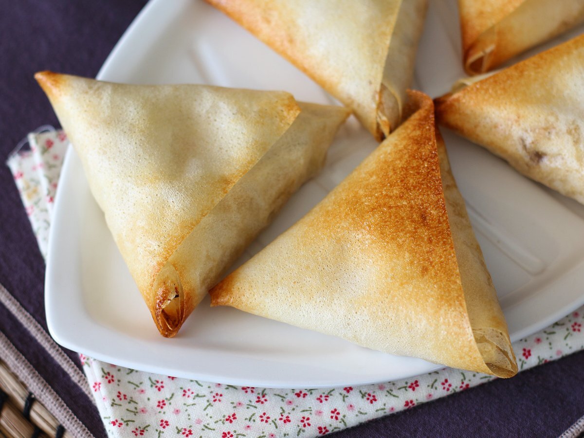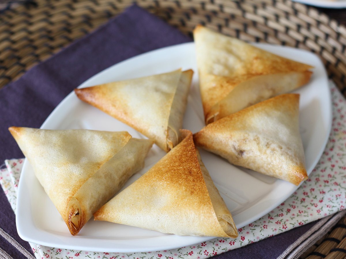 - Platzieren Sie an der Ecke dieses Streifens einen Esslöffel Ihrer Makrelenfüllung. Falten Sie die obere linke Ecke Ihres Streifens nach unten, sodass ein Dreieck entsteht. Falten Sie dann den unteren Teil nach oben, um mit der Herstellung Ihrer Samosa fortzufahren. Wiederholen Sie den Vorgang bis zum Ende des Streifens. Verschließen Sie die Samosa, indem Sie den Rest des Blattes in die Falte schieben.