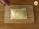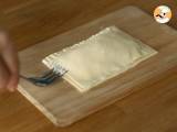 Mit einem weiteren Rechteck Blätterteig bedecken und die Ränder mit einer Gabel verschließen.