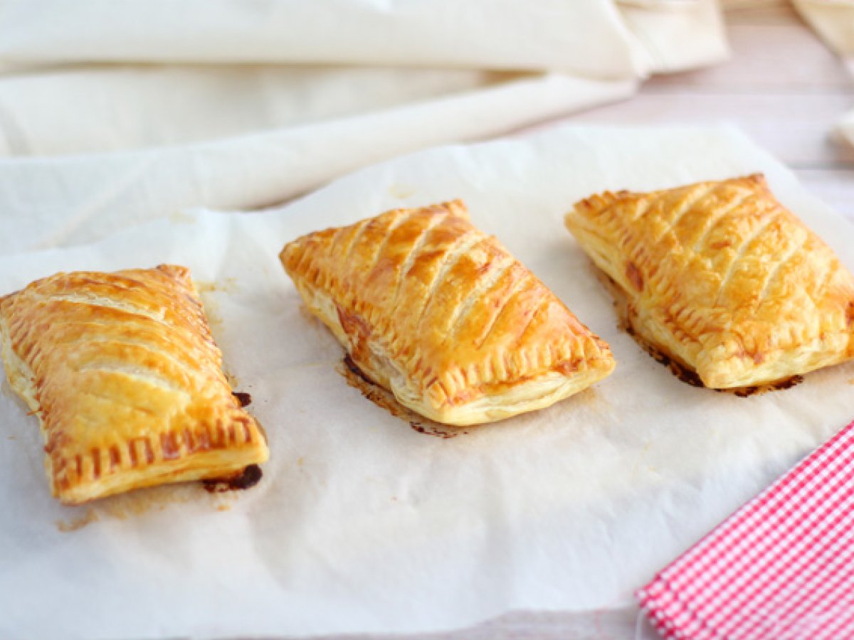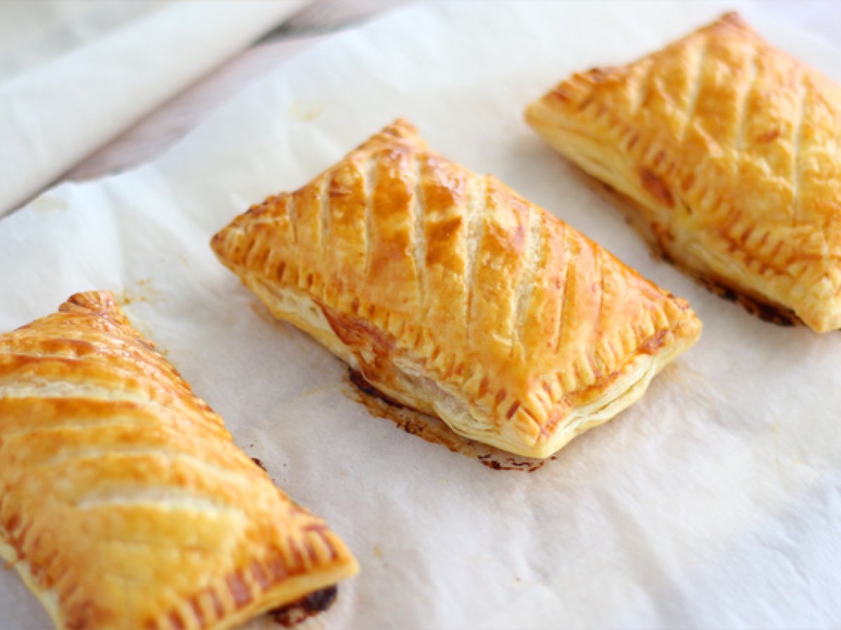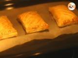 Den Blätterteig in 8 gleich große Rechtecke schneiden.