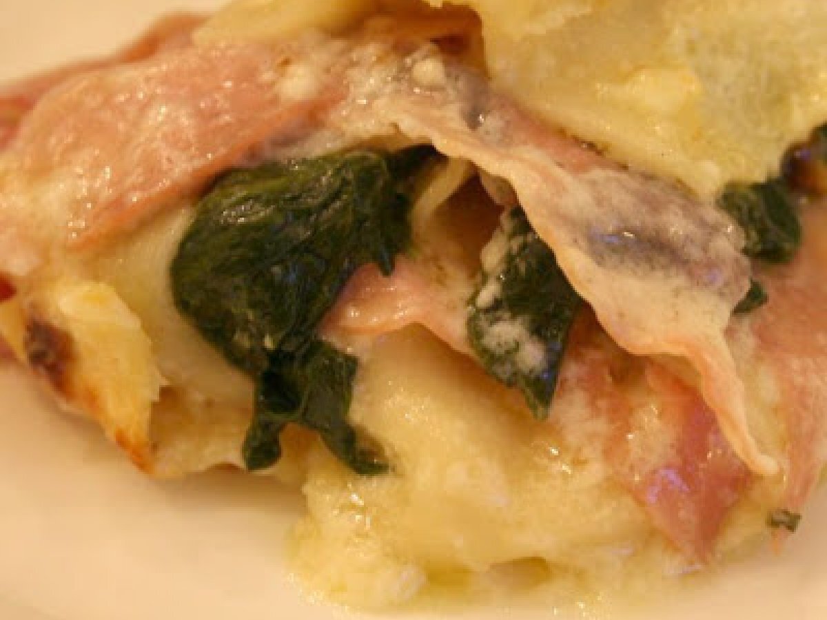 - Nun, Spinat und Schinken Blätter, Béchamelsauce und Lasagne. SO 2 - 3 mal Batterie, sondern schließen mit Platten aus Pasta.