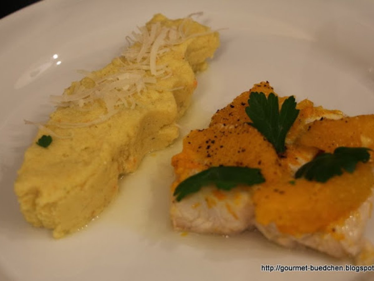 - In eine gefettete Auflaufform die Steinbeißerfilet legen, darauf die Orangenfilets und die abgeriebene Orangenschale geben.