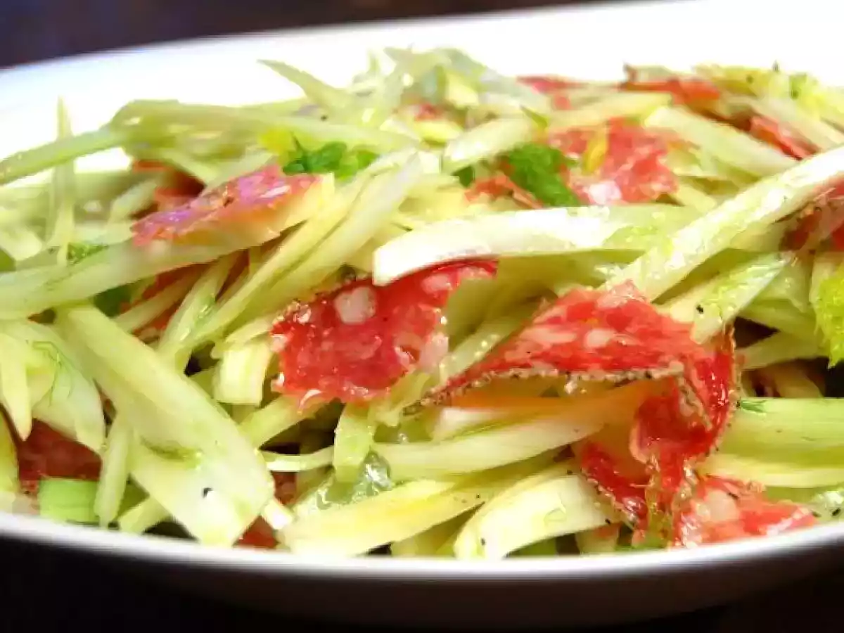- Salami in Stücke reißen und mit Fenchel mischen.
