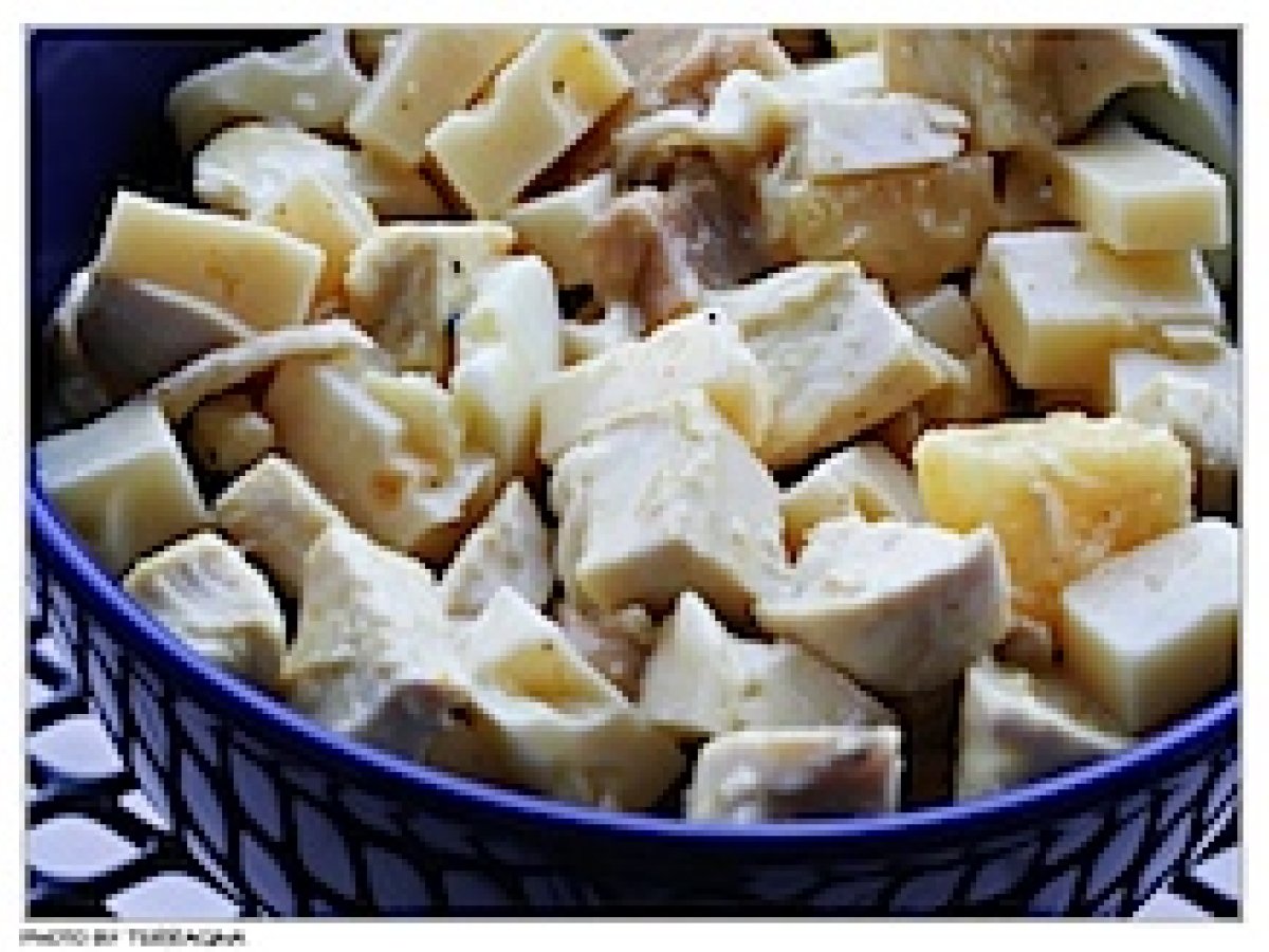 - Schnittkäse in Würfel schneiden, Champignons und Eier in Scheiben schneiden.