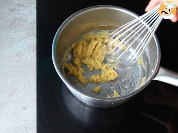Schmelzen Sie die Butter in einem Topf. Dann geben Sie das Mehl auf einmal hinzu und verrühren es mit einem Schneebesen.