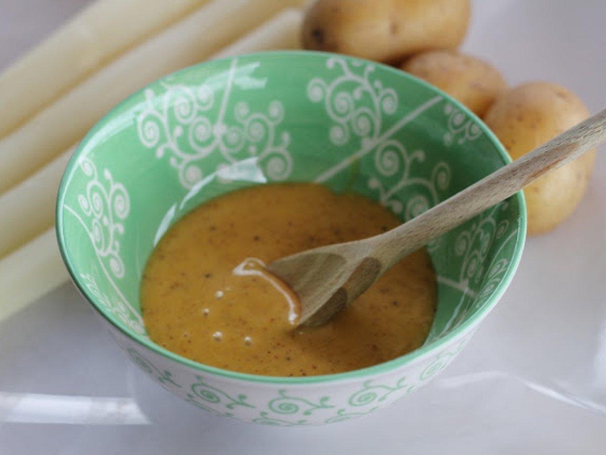 - Geben Sie 1 Holzlöffel dicken orangefarbenen Senf und etwas Ursenf in eine Schüssel geben.