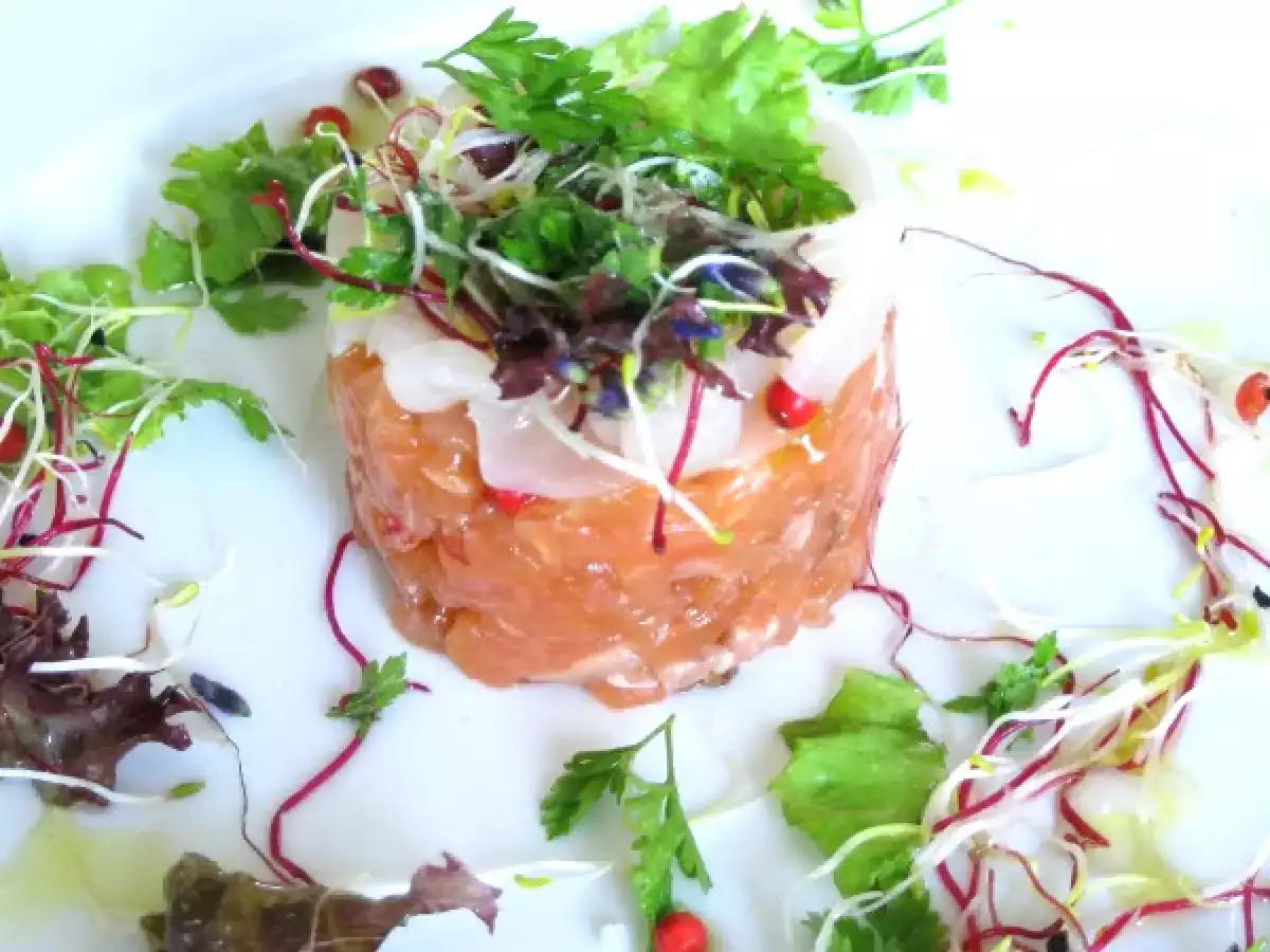 - Marinieren mit Zitronensaft, Olivenöl, ganz rosa Pfefferkörnern und Salz.
