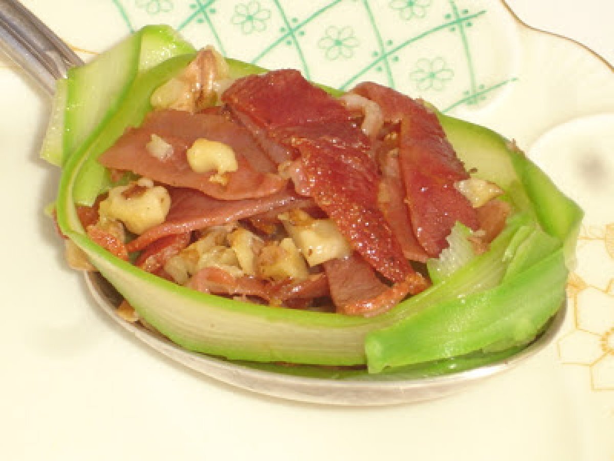 - Schinken und Pistazien Mischung Füllen des Inneren des Rings Spargel.