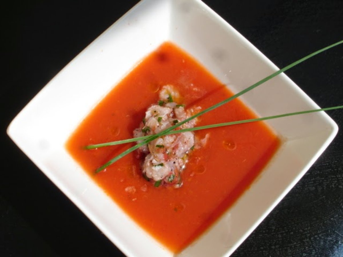 - Aus dem Garnelentartar mit zwei Löffeln Quenelles formen. Etwas von der Tomatengazpacho im einen tiefen Teller füllen. Ein Garnelenquenelle in die Mitte des Tellers legen. Mit Fleur de Sel oder Maldonsalz bestreuen und ein paar Tropfen Olivenöl beträufeln.