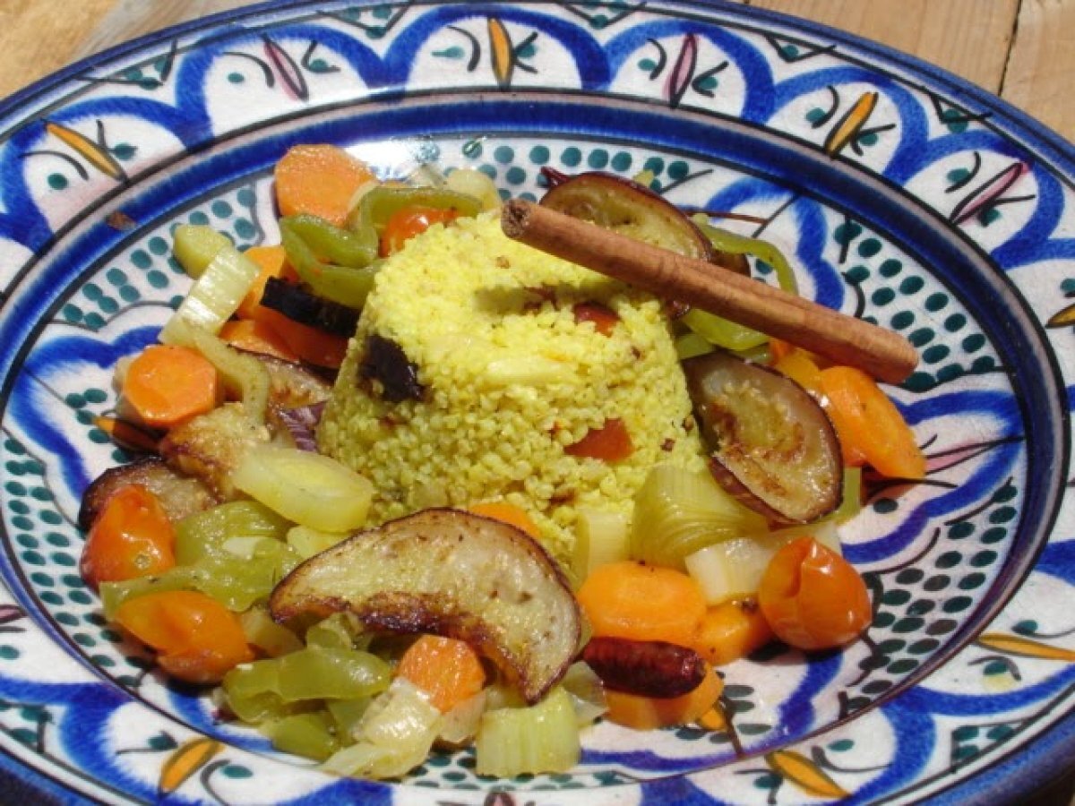 - Die Gemüsebrühe angießen. Kumquatschale, Rosinen, Zimtstange, Cumin, Safranfäden, Orangensalz und Pfeffer zugeben. Im geschlossenen Topf circa 25-30 Minuten köcheln lassen, bis die Flüssigkeit verdampft ist.