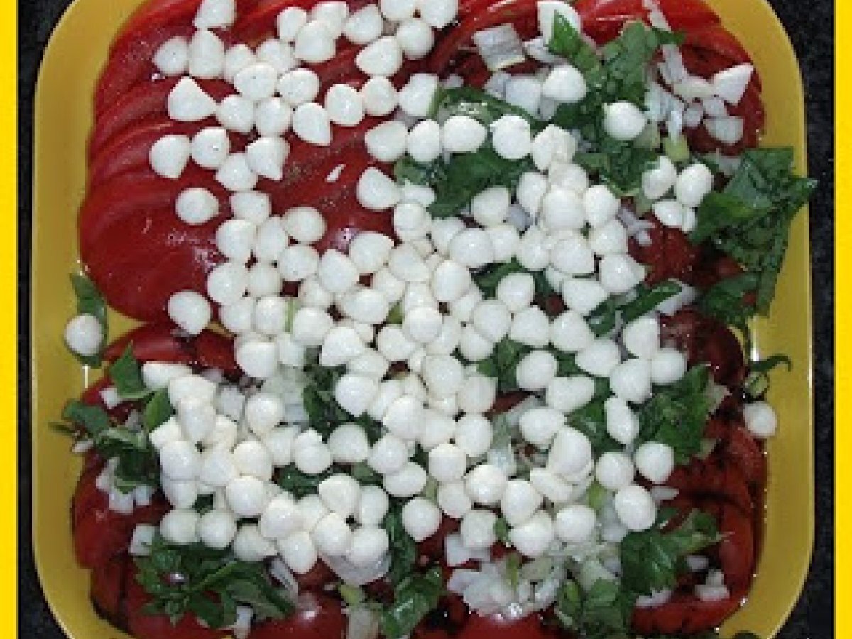 - Die Tomaten und in Scheiben schneiden, auf einen Teller legen.