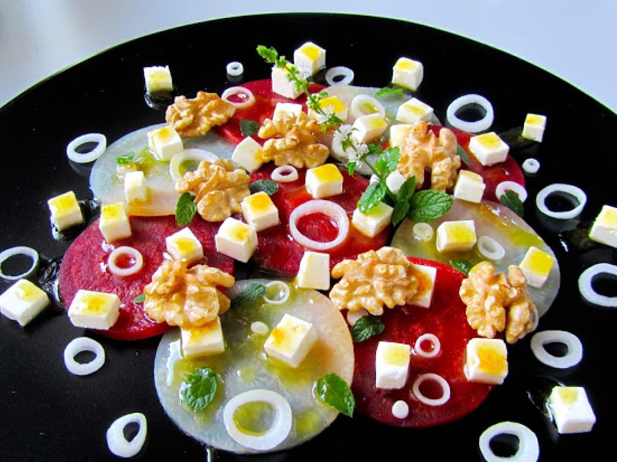 - Die Chioggia Rübe auf einem flachen Teller rosettenförmig auflegen, mit etwas Dressing bepinseln. Restliche Zutaten auf dem Teller verteilen und nochmals Dressing darüber verteilen. Mit frischem Fladenbrot servieren.