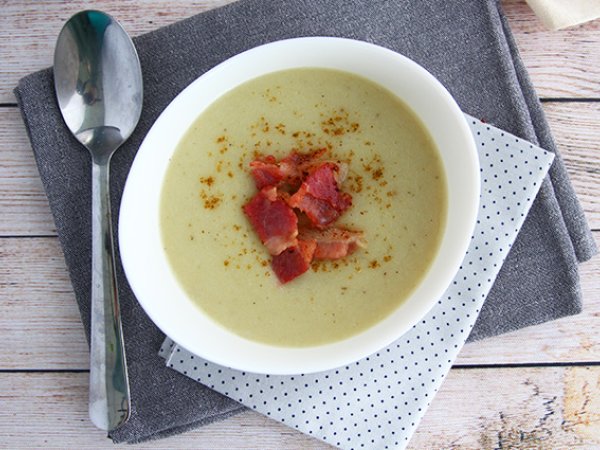 In einer Schüssel servieren. Die Speckscheiben in kleine Stücke schneiden und in einer heißen Pfanne grillen. Einige Stücke über der Suppe verteilen. Und los geht's!