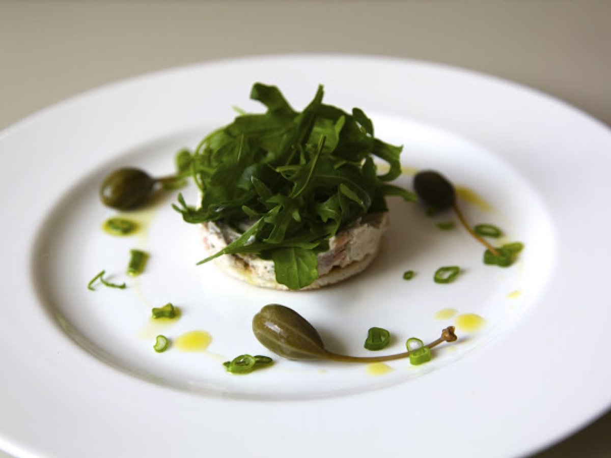 Tuna-mousse auf tramezzini-cracker und rucola