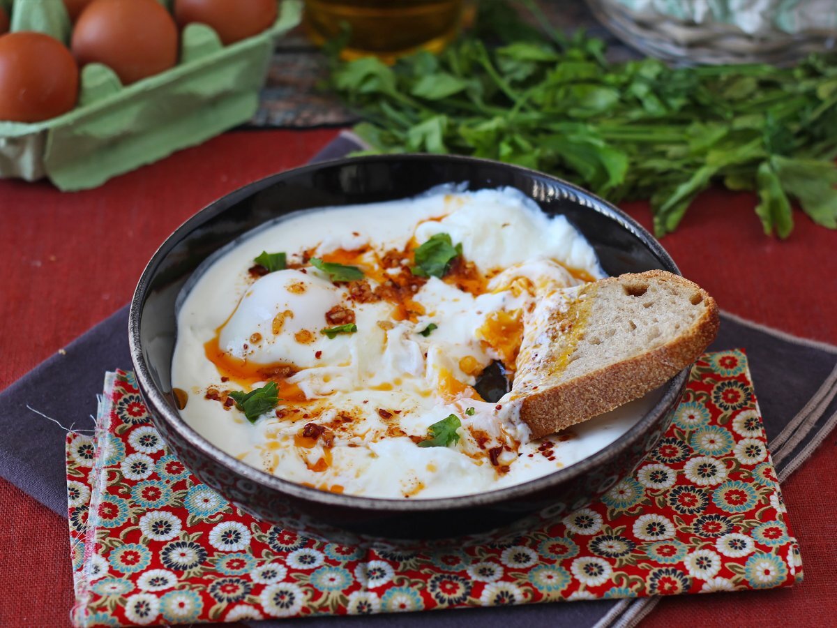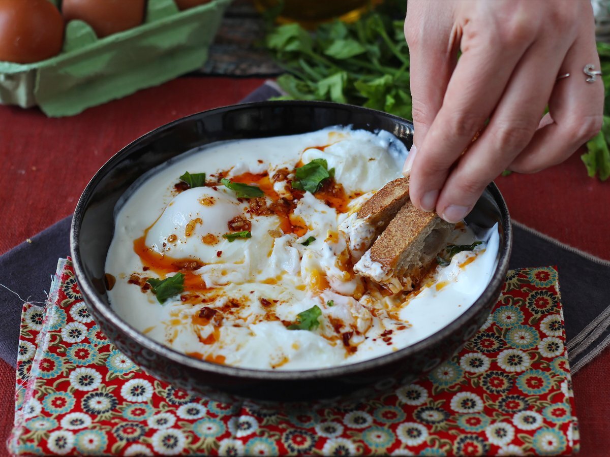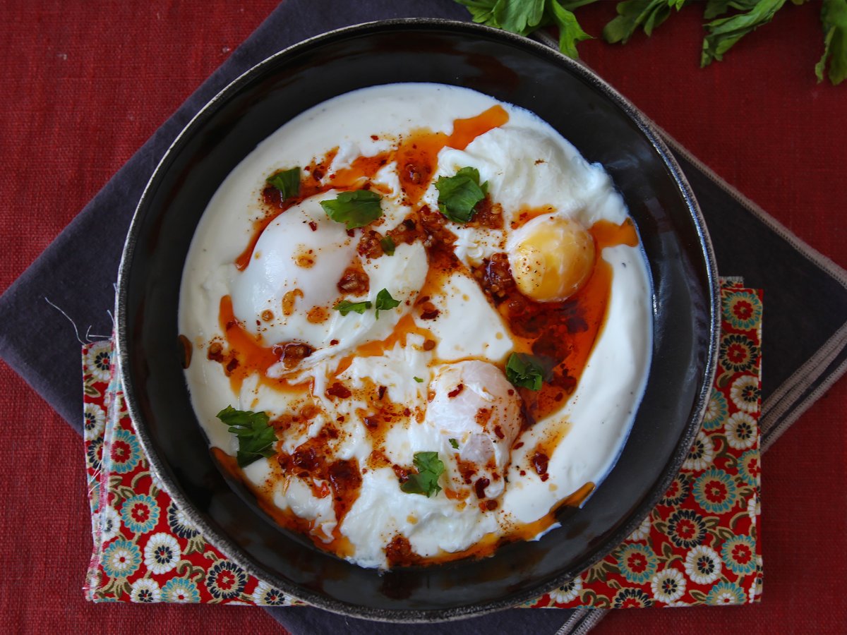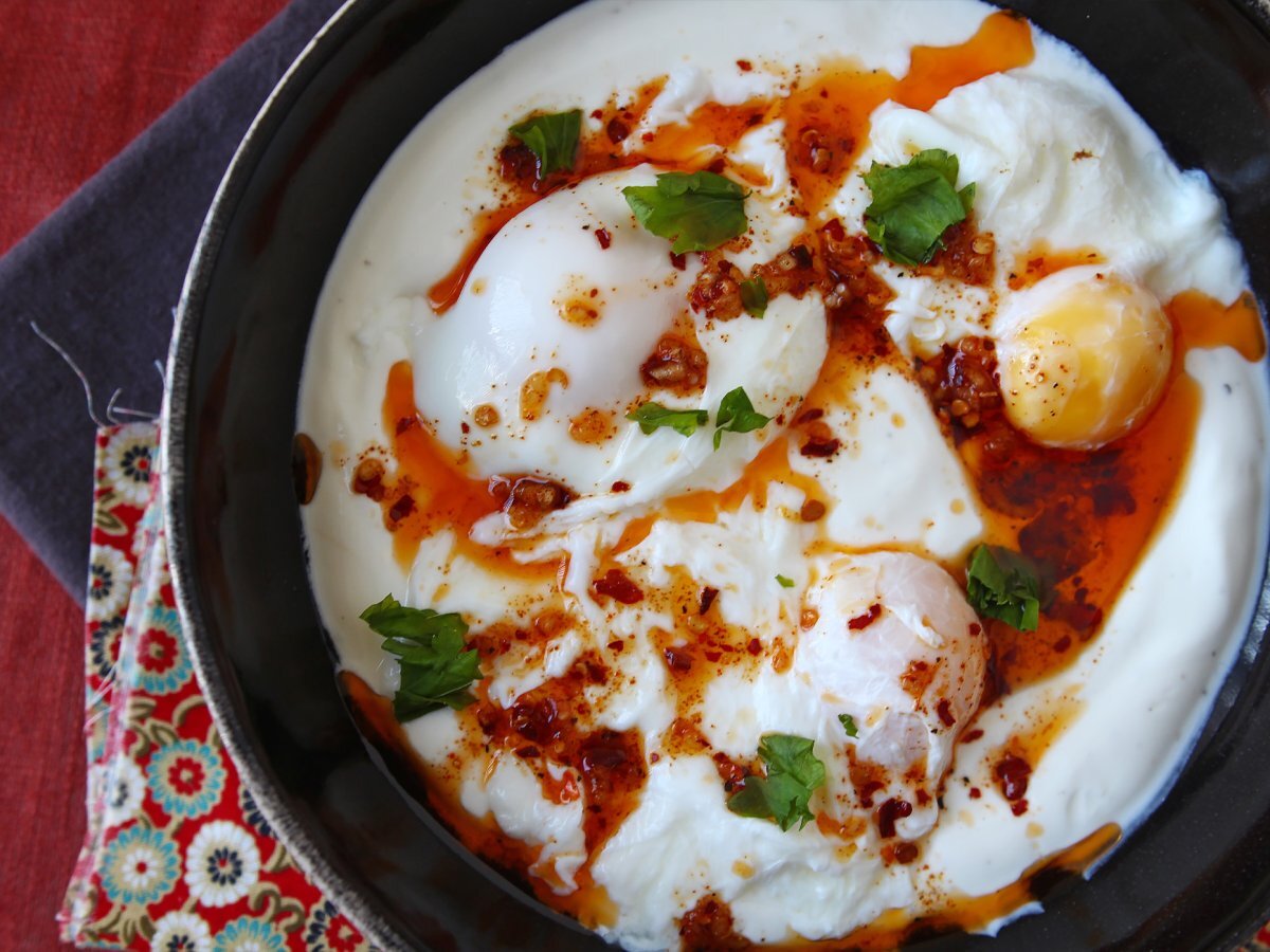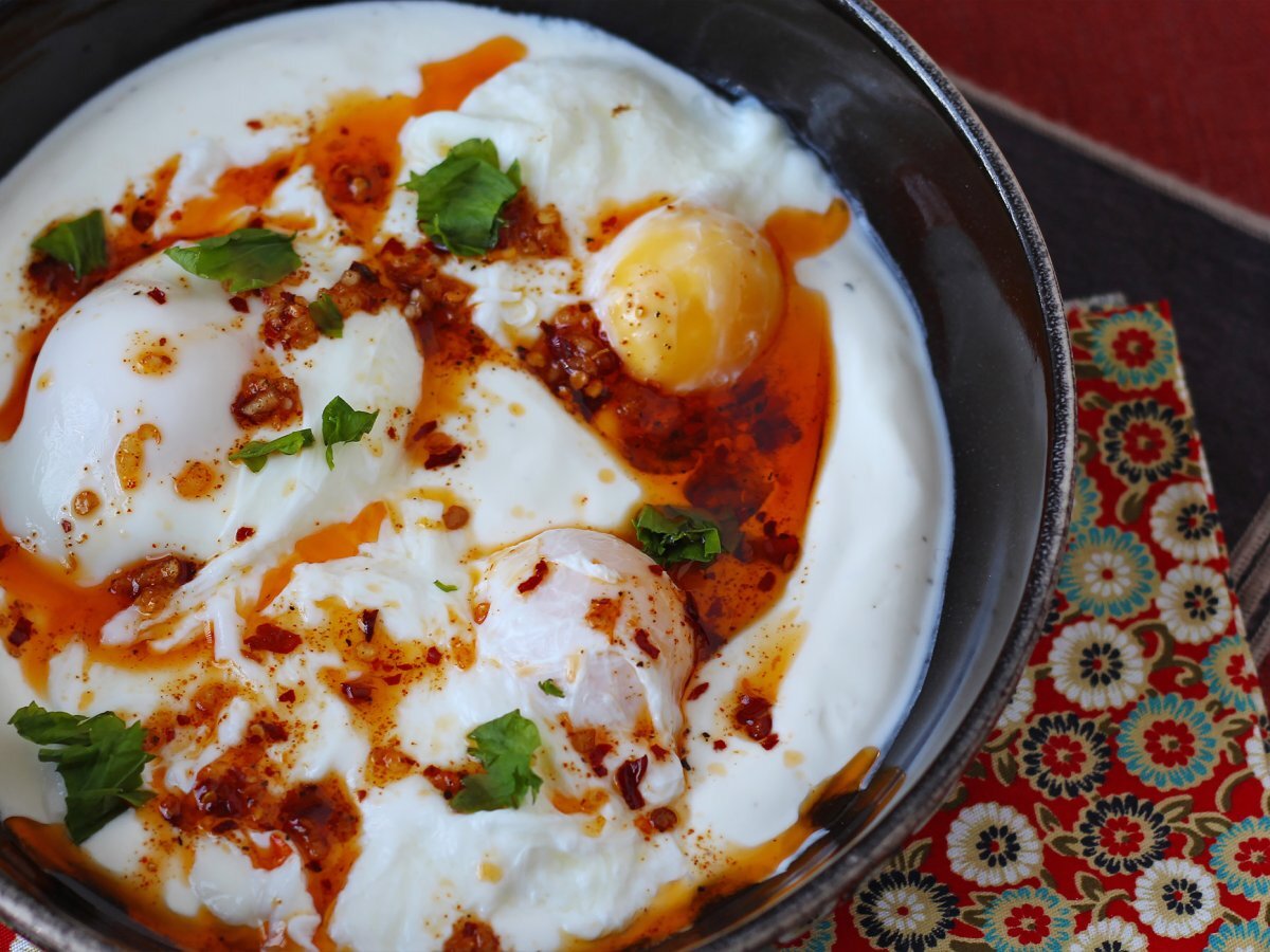 Türkische eier auf joghurtbasis mit pikantem öl - çilbir