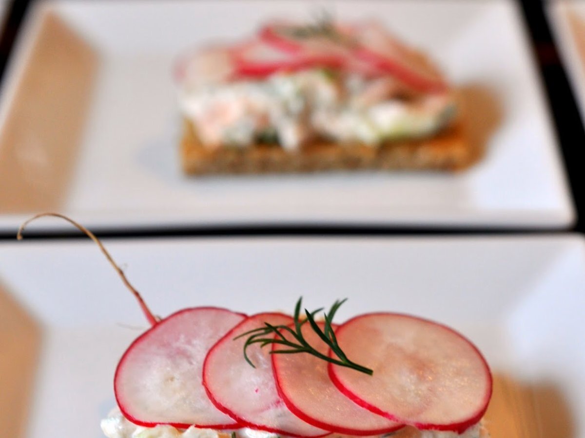 - Mit dem Tatar belegen und ein paar Radieserlscheiben dekorieren.