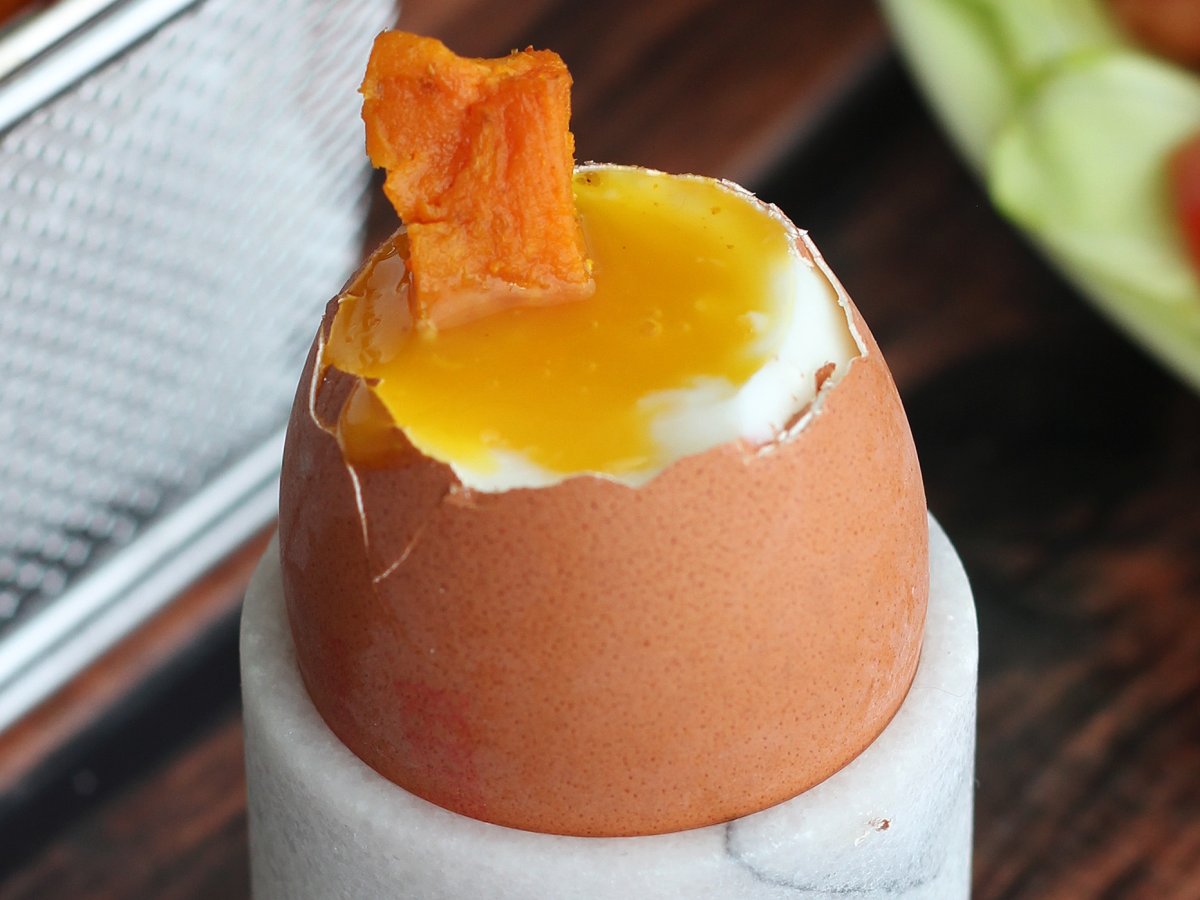 - 5 Minuten nach Garende der Süßkartoffeln die Eier 3 Minuten in einem Topf mit kochendem Wasser geben.