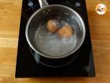 Tauchen Sie die Eier in kochendes Wasser und kochen Sie sie 5 Minuten und 30 Sekunden lang.
