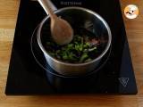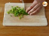 Die Frühlingszwiebel fein hacken: Sie benötigen nur den grünen Teil. Die Speisestärke mit etwas Wasser (ca. 1 EL) verrühren.
