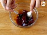 Sojasauce, Wasser, braunen Zucker und Reisessig in einen Topf geben. Fügen Sie die Frühlingszwiebel und die zerdrückte Knoblauchzehe hinzu. Bei starker Hitze unter Rühren etwa 3 bis 5 Minuten karamellisieren lassen.