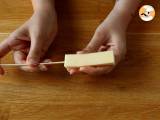 Schneiden Sie den Emmentaler in 8 gleichgroße rechteckige Stücke und stecken Sie die Spieße in die Käsestangen.