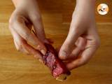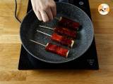 Mischen Sie das Rindercarpaccio mit der Soße (Sie können etwas Soße beiseite legen, um die Spieße beim Probieren einzutauchen oder die Spieße beim Kochen damit zu bestreichen). 1 Stunde kalt stellen.