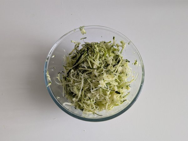 Die Zucchini gründlich waschen, an den Enden abschneiden und mit einer Großlochreibe reiben. Beiseite stellen und ruhen lassen.