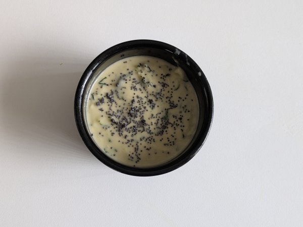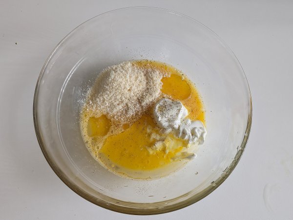 Die Eier in eine Schüssel schlagen, geriebenen Parmesan, Skyr (oder griechischen Joghurt), Kernöl, Salz und Pfeffer hinzufügen. Mischen, bis die Masse glatt ist.