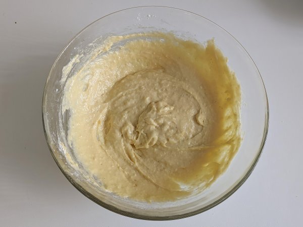 Backpulver und Mehl (nach und nach) zu der Mischung geben und mit einem Spatel verrühren, bis der Teig glatt und klumpenfrei ist.