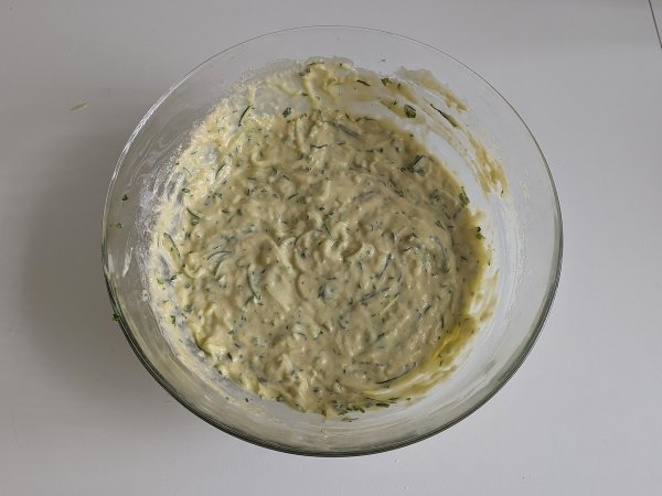 Die geriebenen Zucchini und das fein gehackte Basilikum hinzugeben und alle Zutaten gut verrühren.