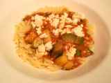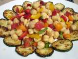 Gebratene nudeln mit gerösteten kichererbsen und zucchini
